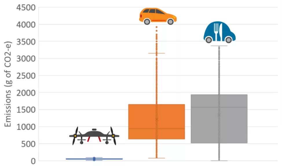 And while the drones were traveling farther (on average) than the delivery modes in the other scenarios, this increase in travel distance was offset by their small size and light weight. In fact, pickup and delivery generated approximately 26 to 28 times more emissions than drone delivery, respectively.