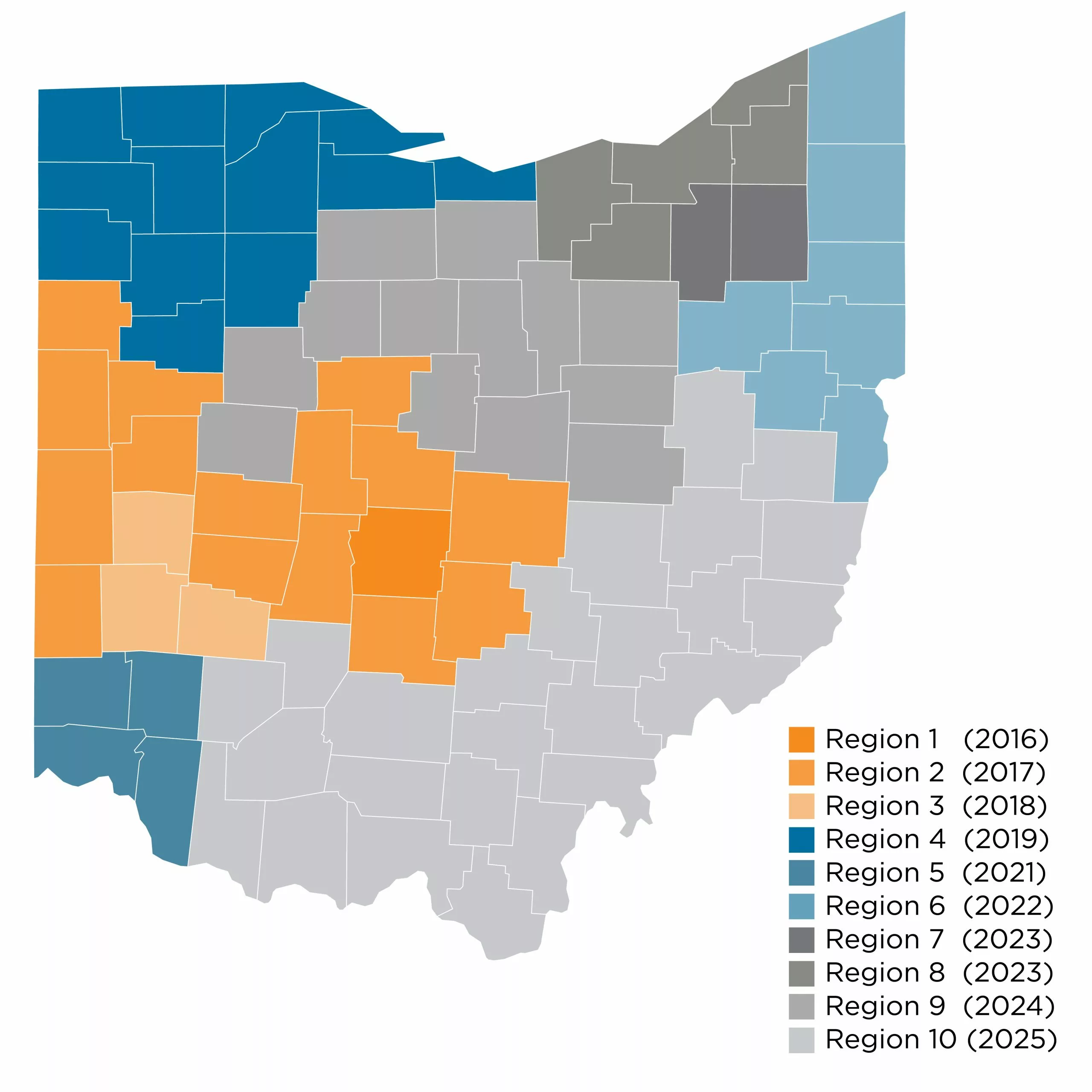 For the Ohio Moves Transportation Study, ODOT segmented the state into 10 regions. Using this method, one region is surveyed each year using a region-specific sampling plan, collecting data from approximately 2,300 households, or around 0.5% of households in each region. Each household receives an invitation to participate using rMove. Researchers weight and expand these data to represent the entire region. This approach puts ODOT on a decennial cycle to collecting and combining travel survey data for the entire state. ODOT administers these surveys between September and April, with a short pause in data collection between December and January to account for periods of anomalous travel around the holidays. A long-distance survey, the Ohio Moves Long-Distance Study, is a separate six-month study that most households also participate in to collect data on trips over 50 miles.